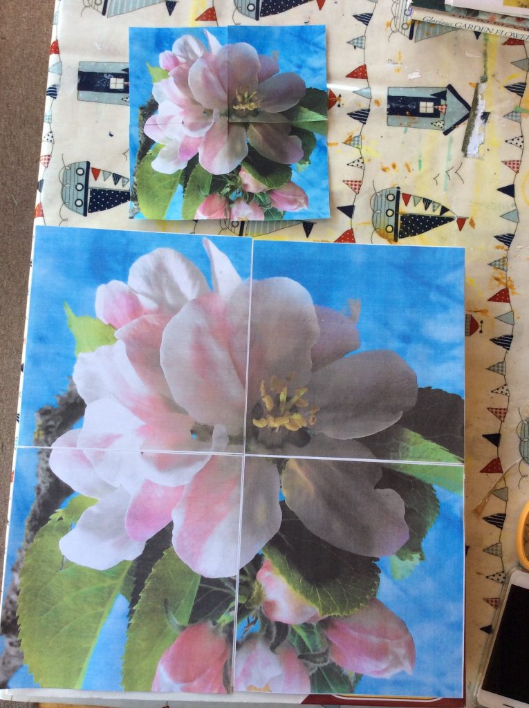 To make the image fit the canvas I need to expand it to fit to size. This is done by dividing the image in four and scanning each quarter and printing it as a full page to create a template for my collage.
